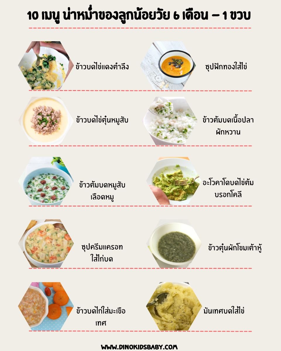 วันนี้คุณหมอจะขอยกตัวอย่าง 10 เมนู น่าหม่ำของลูกน้อยวัย 6 เดือน - 1 ขวบ ที่น่าอร่อย ทำได้ง่ายและมีคุณค่าทางโภชนาการอย่างครบถ้วน มาแนะนำคุณพ่อคุณแม่กันค่ะ