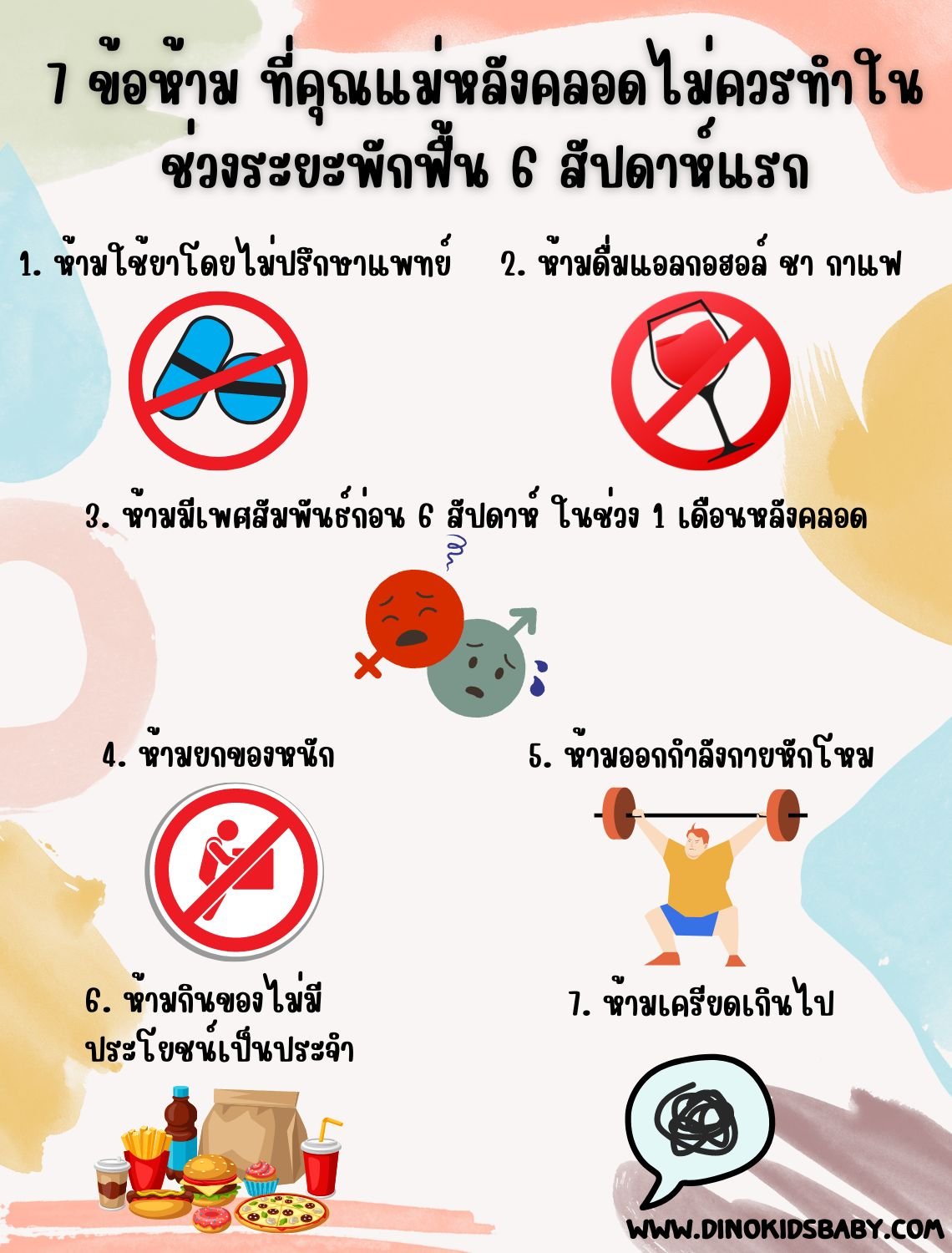 การดูแลตัวเองหลังคลอดเป็นเรื่องที่สำคัญสำหรับคุณแม่มาก โดยเฉพาะในช่วงระยะพักฟื้น 6 สัปดาห์แรก หรือ 1 เดือนแรกหลังคลอดบุตร คุณพ่ออาจจะต้องช่วยดูแลคุณแม่ตัวเองให้ดี และไม่ให้คุณแม่ปฏิบัติข้อห้ามเหล่านี้ ที่นอกจากจะมีผลต่อร่างกายคุณแม่แล้ว ยังมีผลต่อการให้นมทารกและภาพจิตใจของคุณแม่ได้ด้วย
