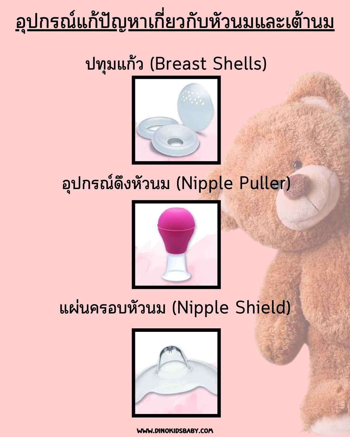 อุปกรณ์ดึงหัวนม (Nipple Puller) ลักษณะคล้ายปั๊มนมมือที่มีจุกยางแดงให้ บีบ ให้ดึงหัวนมขึ้นมา อุปกรณ์นี้ไม่แนะนำให้ใช้ เพราะมีแรงดึงที่แรงเกินไปถ้าจำเป็นก็ใช้บีบเบาๆ เท่านั้น อยากแนะนำให้ใช้เป็นกระบอกฉีดยาขนาด 20 มล. ตัดปลายแทนเพราะแรงดึงจะอ่อนโยน ตามน้ำหนักที่เราคุมได้มากกว่า