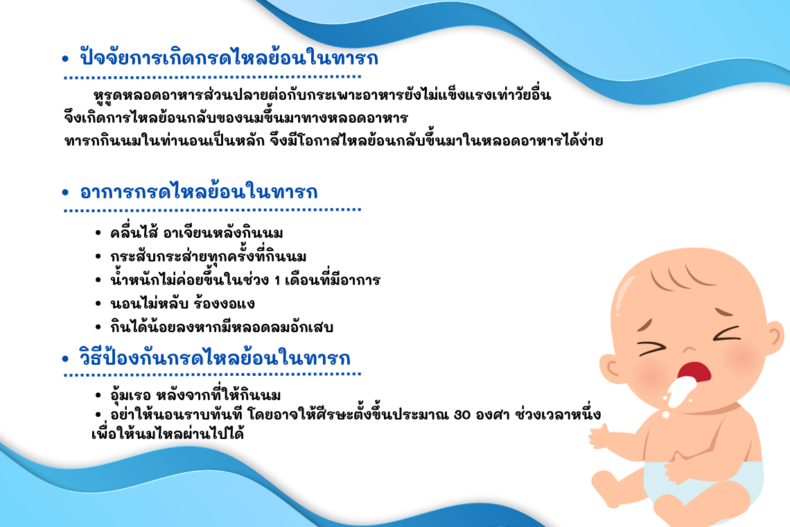 โรคกรดไหลย้อน หลายคนอาจไม่รู้ว่าสามารถเกิดขึ้นกับทารกได้ โดยในทารก 100 คน สามารถเป็นกรดไหลย้อนได้มากถึง 25 คน เป็นอีกหนึ่งปัญหาสุขภาพของทารกที่พ่อแม่หรือผู้ปกครองควรรู้ เพื่อปฏิบัติกับลูกให้เหมาะสม ป้องกันอาการกรดไหลย้อนที่ทำให้ทารกไม่สบายตัว คลื่นไส้ อาเจียน ปวดท้อง และอาจนอนหลับไม่สนิท หากมีอาการรุนแรงทารกจะกินได้น้อยลงอีกด้วย ส่งผลเสียต่อสุขภาพ