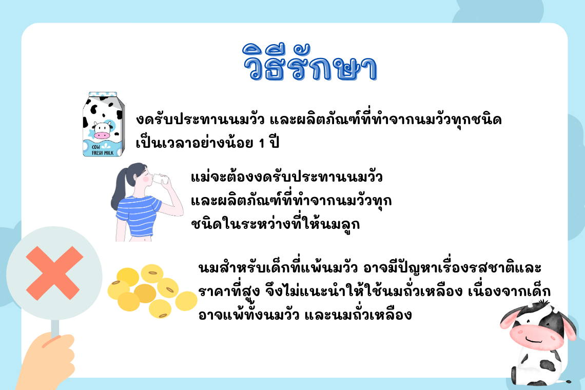 1. การรักษาที่ดีที่สุดคือ งดรับประทานนมวัว และผลิตภัณฑ์ที่ทำจากนมวัวทุกชนิด เป็นเวลาอย่างน้อย 1 ปี