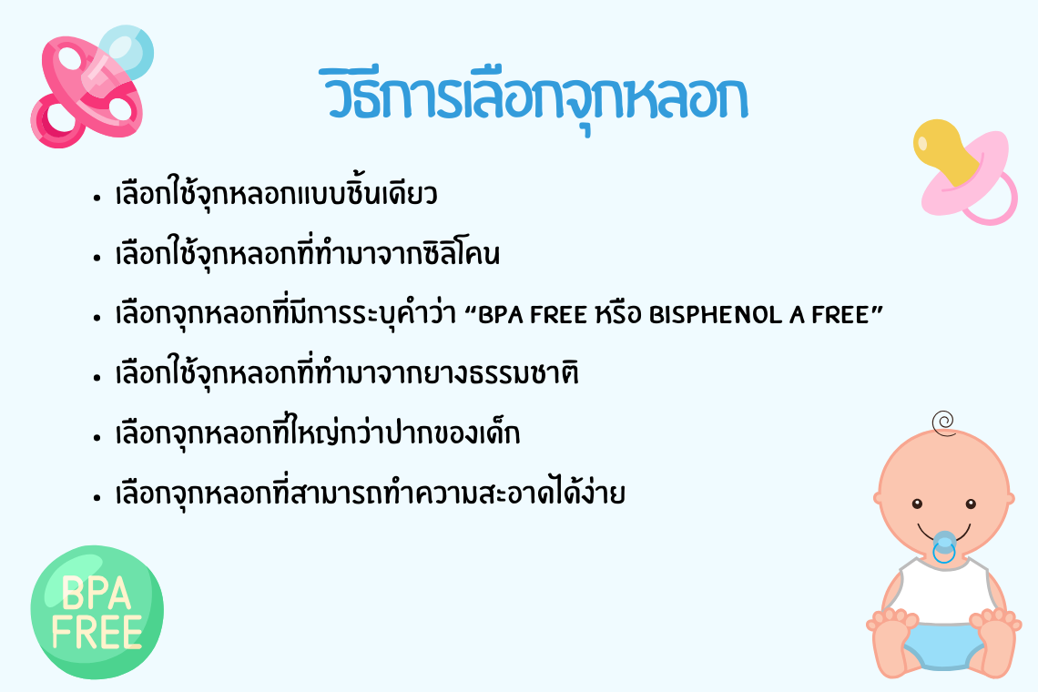• เลือกจุกหลอกที่มีการระบุคำว่า “BPA Free หรือ Bisphenol A Free” เนื่องจากสารชนิดดังกล่าวเสี่ยงที่จะสร้างความผิดปกติต่อร่างกายและพัฒนาการของเด็ก ทั้งยังเป็นสารก่อมะเร็งอีกด้วย