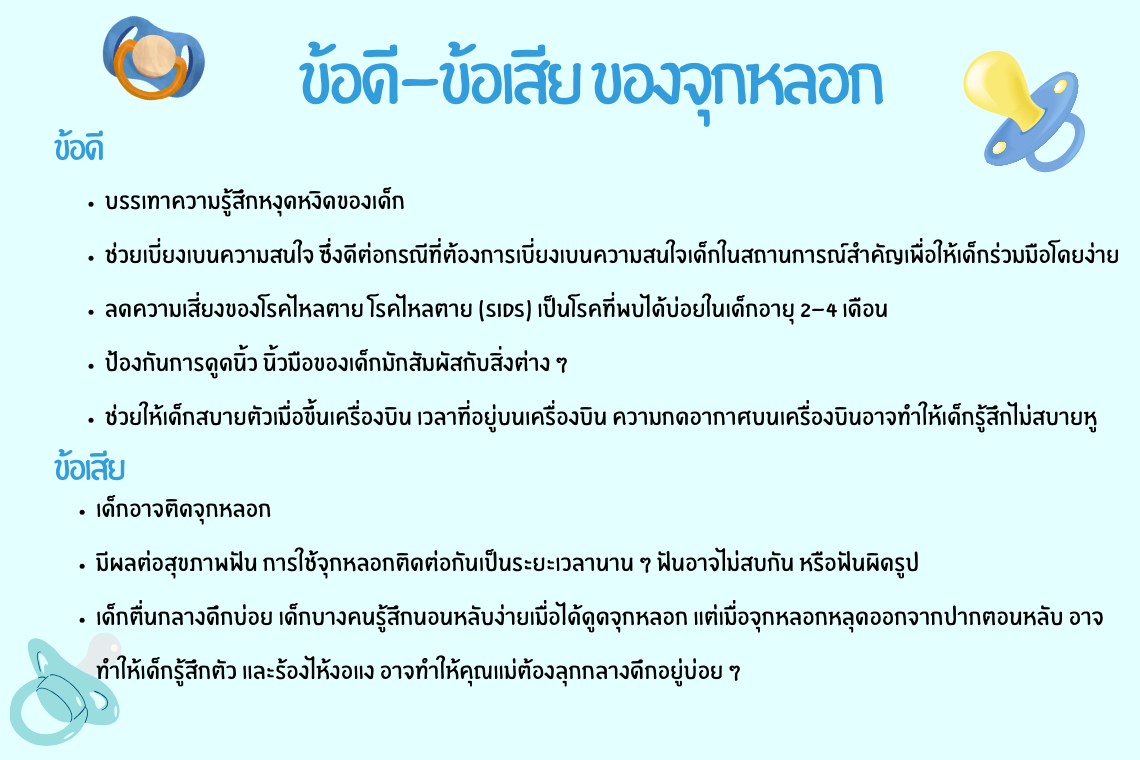 • เด็กตื่นกลางดึกบ่อย เด็กบางคนรู้สึกนอนหลับง่ายเมื่อได้ดูดจุกหลอก แต่เมื่อจุกหลอกหลุดออกจากปากตอนหลับ อาจทำให้เด็กรู้สึกตัว และร้องไห้งอแง อาจทำให้คุณแม่ต้องลุกกลางดึกอยู่บ่อย ๆ