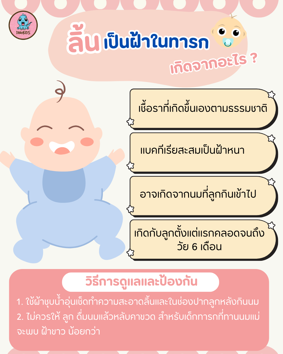 -เชื้อราที่เกิดจากการทำความสะอาดไม่ทั่วถึงจึงเกิดเป็นคราบสะสม ซึ่งคราบสะสมที่เกิดขึ้นนี้อาจเกิดจากนมที่ลูกกินเข้าไป จึงเกิดเชื้อแบคทีเรียสะสมเป็นฝ้าหนาอยู่ที่ลิ้นของเจ้าตัวเล็ก