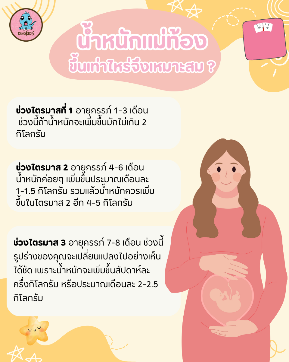 แม่ท้องอาจคิดว่าน้ำหนักเพิ่มมากขึ้นเท่าไหร่ลูกในครรภ์ก็จะยิ่งตัวโตแข็งแรง บางคนมีน้ำหนักตอนตั้งครรภ์เพิ่มขึ้นเกือบ 20 กิโลกรัม ในขณะที่แม่บางคนก็เบื่ออาหารทานไม่ค่อยได้ทำให้น้ำหนักเพิ่มขึ้นน้อยซึ่งสร้างความกังวลใจอย่างมาก ทั้งนี้ตามหลักแล้วคุณแม่ตั้งครรภ์ควรจะน้ำหนักเพิ่มขึ้นประมาณ 10-15 กิโลกรัม หรือเฉลี่ยประมาณ 12.5 กิโลกรัม ทั้งนี้ขึ้นอยู่กับดัชนีมวลกายของคุณแม่ก่อนตั้งครรภ์ด้วย โดยการตั้งครรภ์แต่ละไตรมาสก็จะมีน้ำหนักตัวเพิ่มขึ้นไม่เท่ากันดังนี้